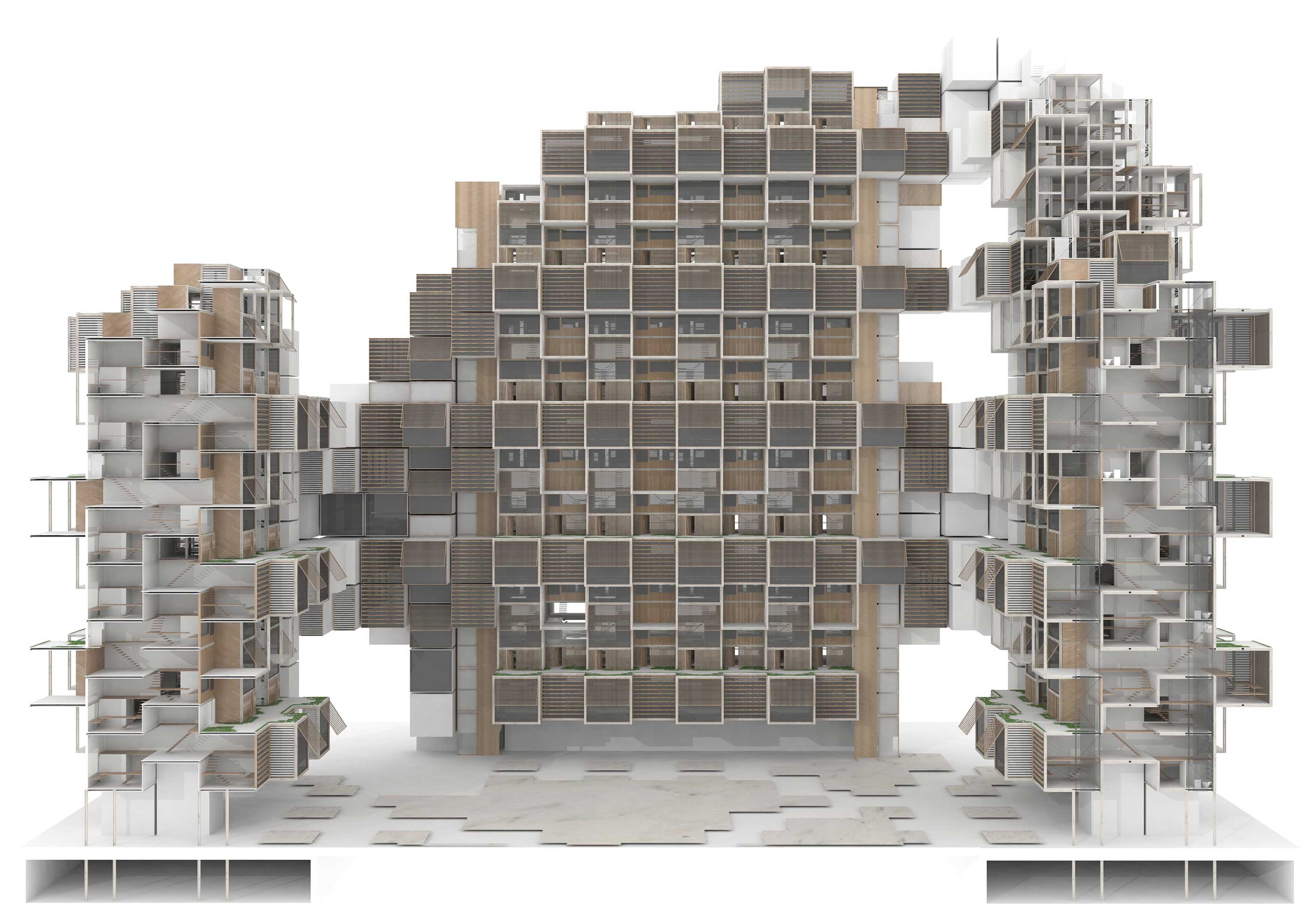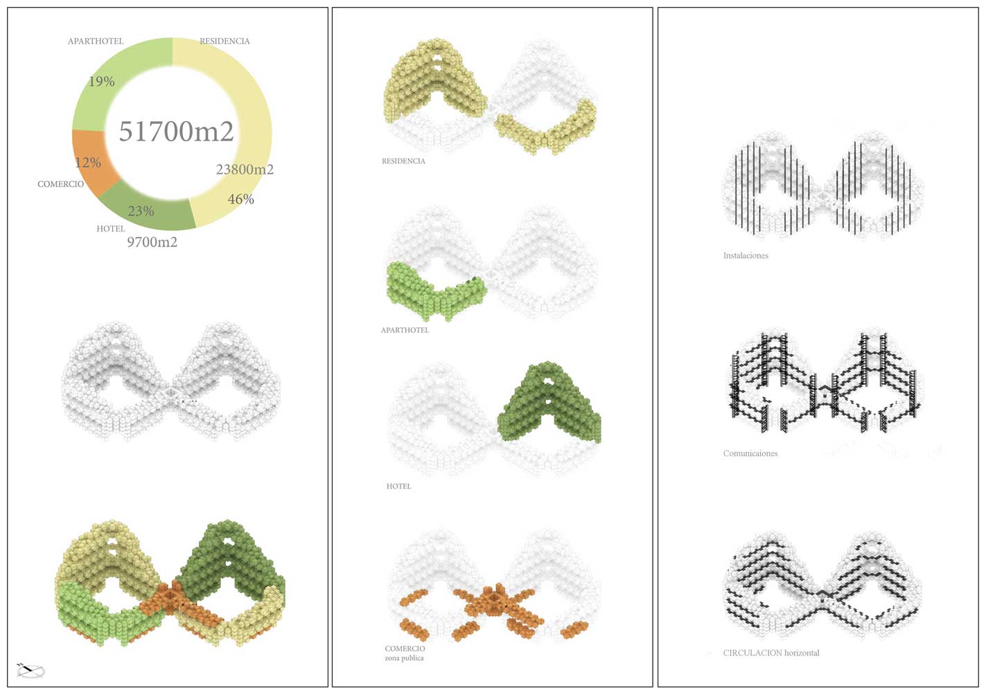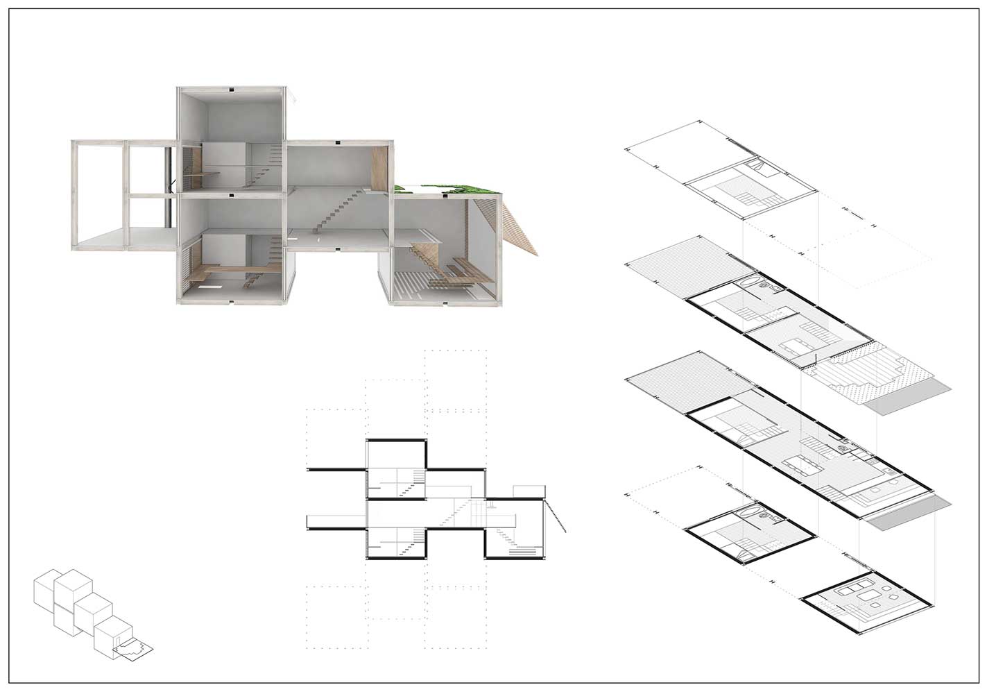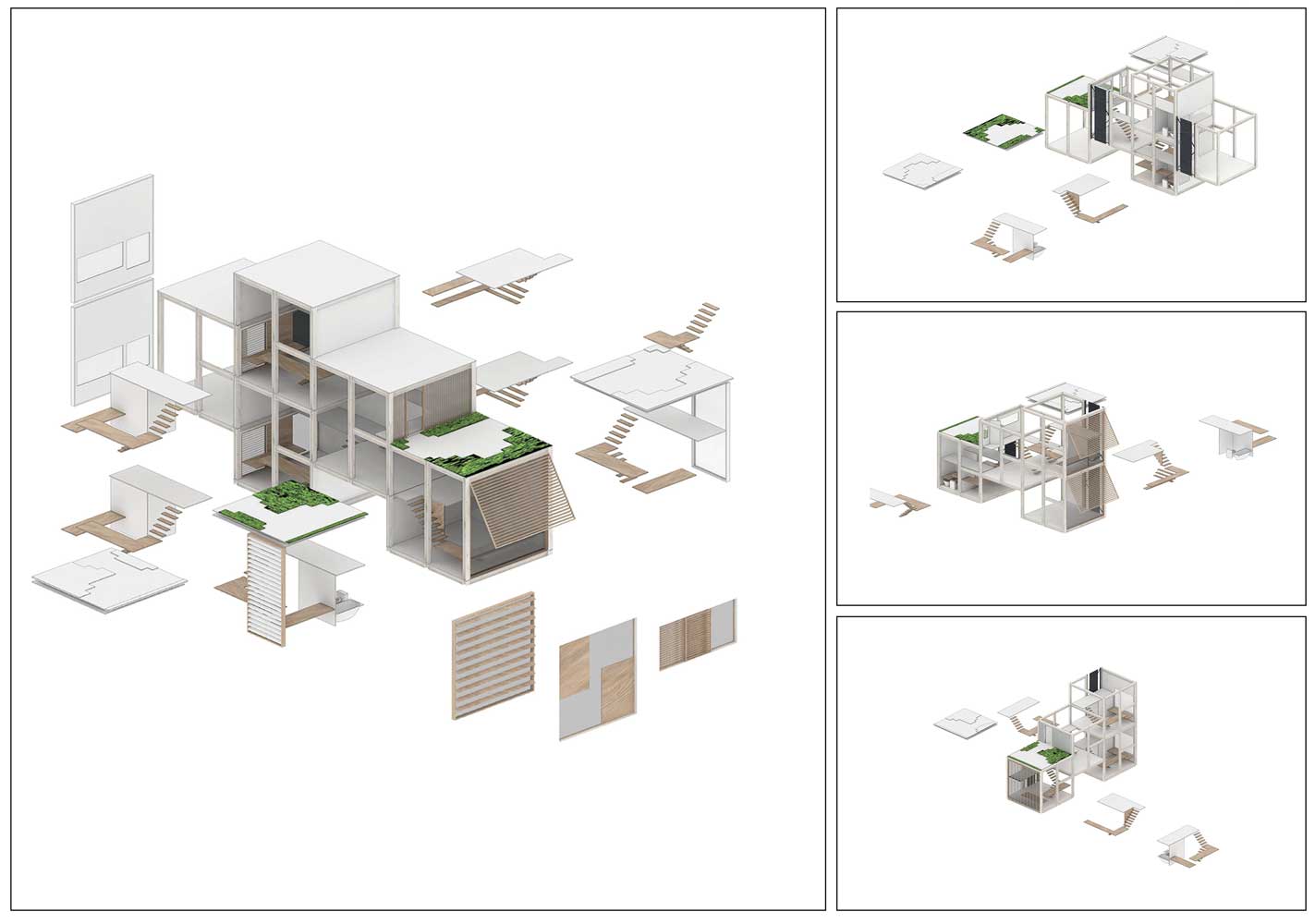 This proposal explores the factor of appropriation of space by the user and the possibilities of growth and reduction of the habitat over time. A new lifestyle is on the horizon and a change in the way we live comes with it. The possibility to add and deduct space over time as our family and needs change is one of the main proposals addressed.