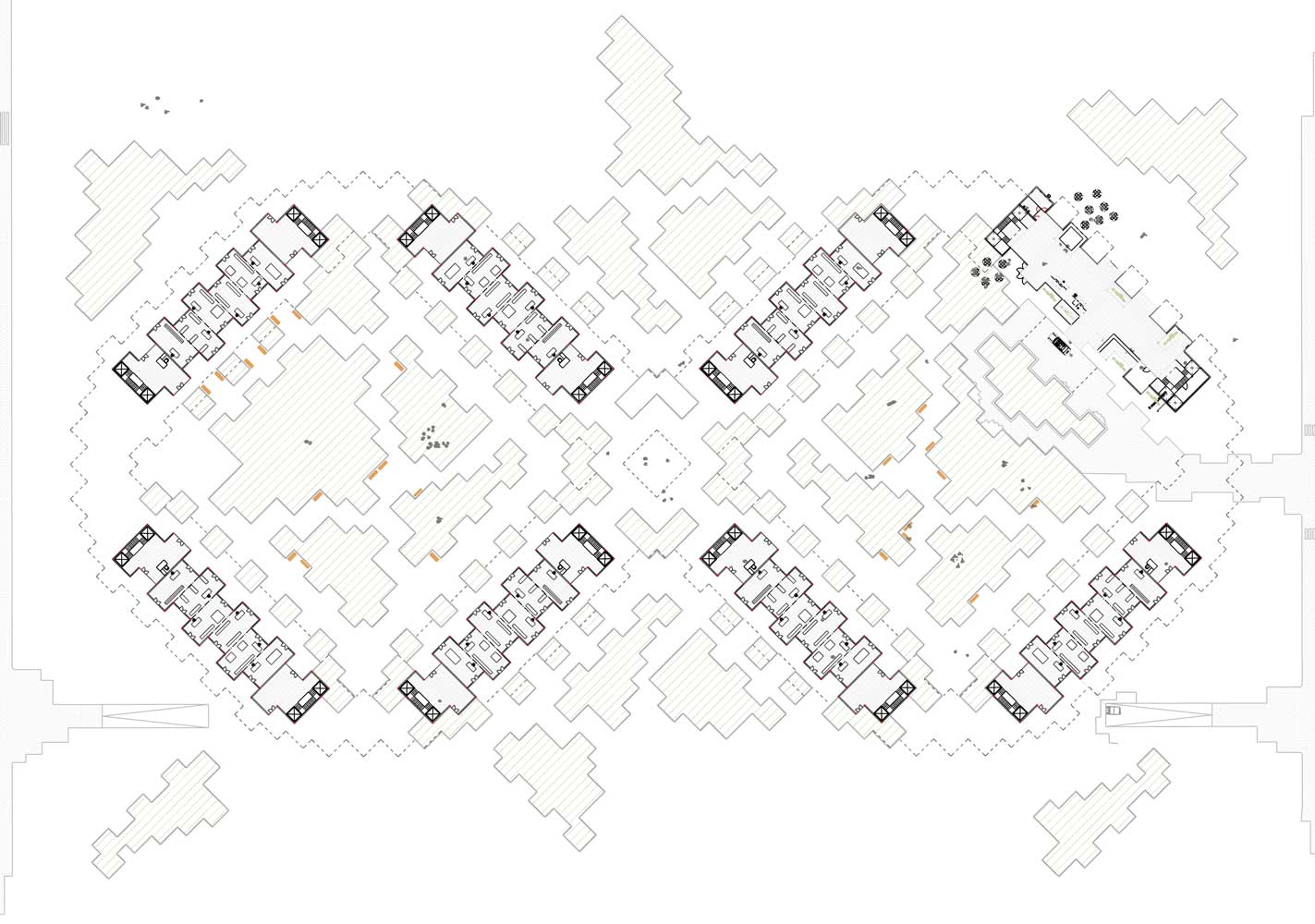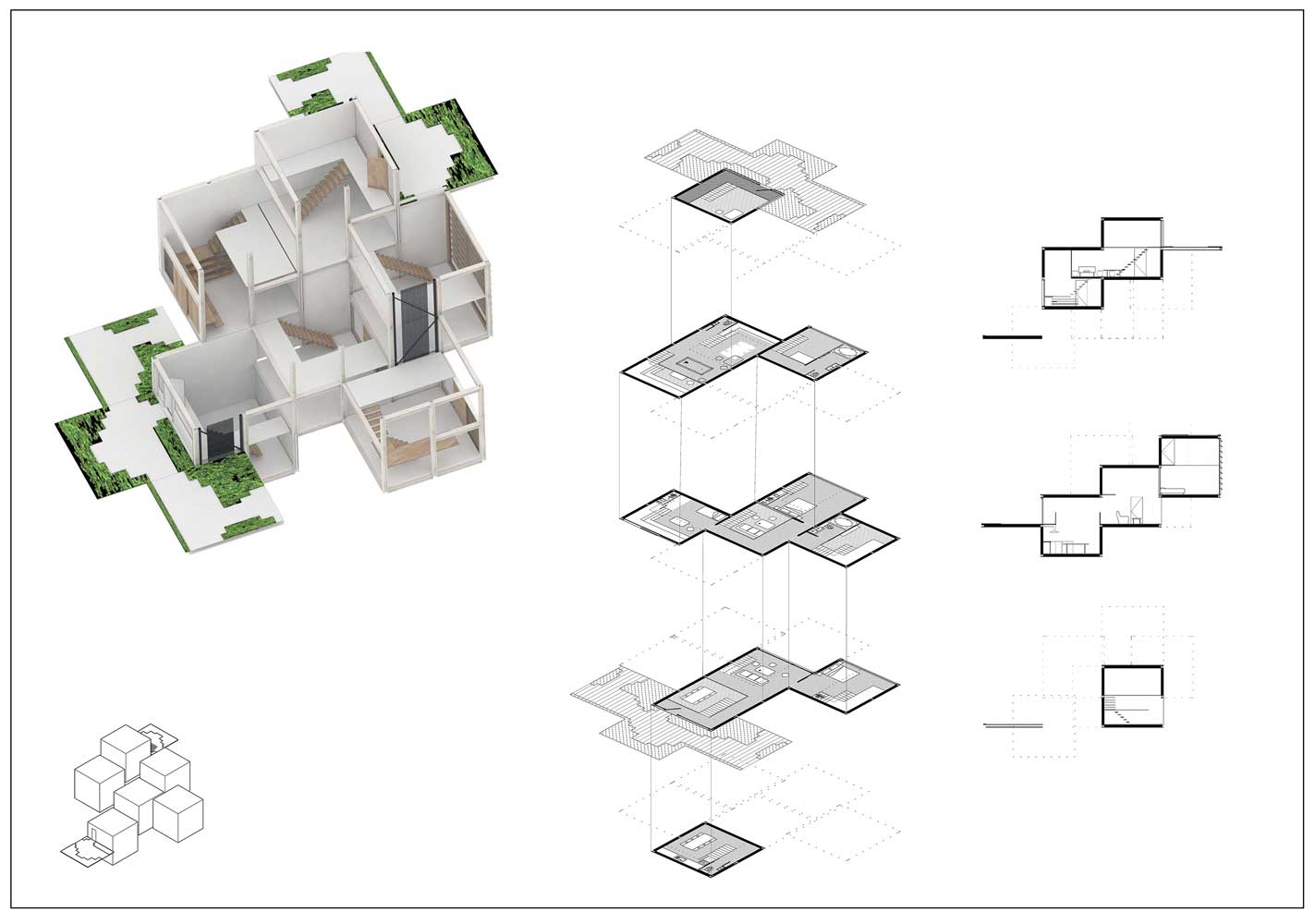 Parting from the simple element of a cube, its repetition and displacement multiplies the number of adjacent accessible spaces. These in turn are equipped with a number of different layouts depending on accessibility needs.